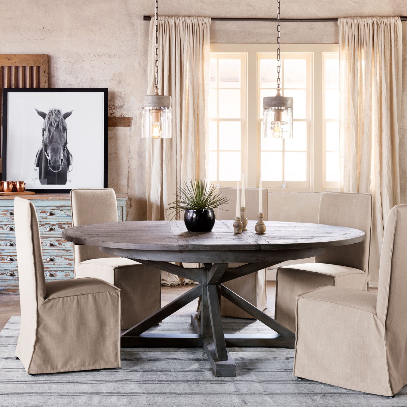 Round Farmhouse Dining Table Etsy from i.etsystatic.com When required, you can extend the two end pieces to add 53. Round tables typically have a pedestal base and are great for fitting into a corner or squeezing extra guests around. Round table, six chairs, distressed white and dark oak. If you have any questions, just shoot me a comment! The extensions slot effortlessly into one end of the table on two arms, making each extension piece 1m in length including the arms. With thanksgiving rapidly approaching, this table is the perfect size to fit your whole family. Get a round farmhouse table 23. Weathered grey farmhouse dining table: